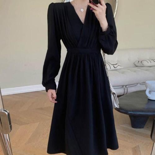 POMTOR 여성 봄가을 하객룩 하이넥 슬림핏 롱 드레스