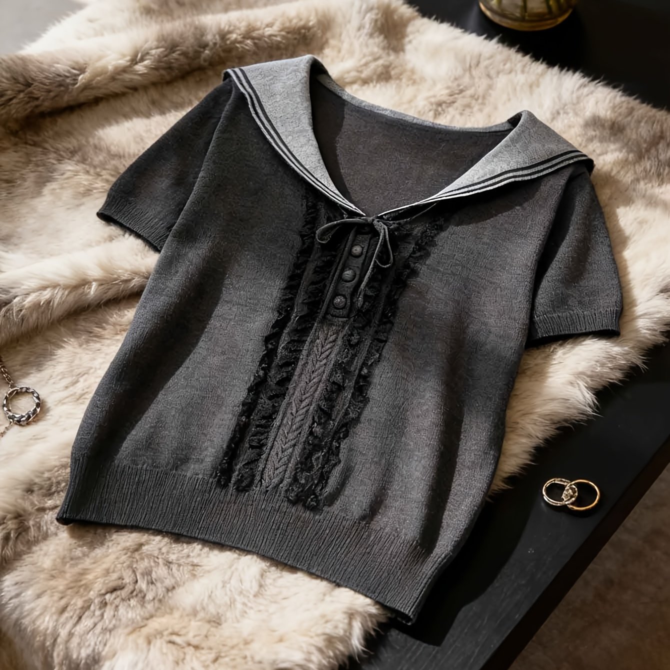 TEMU REZUOFI 여성용 반팔 블라우스 - 슬림핏 칼리지 스타일 탑, 네이비 칼라 & 레이스 소매, 대비 트림, 중간 신축성, 봄/여름용, 사무실, 캐주얼, 세미포멀 웨어, 세탁기 사용 가능