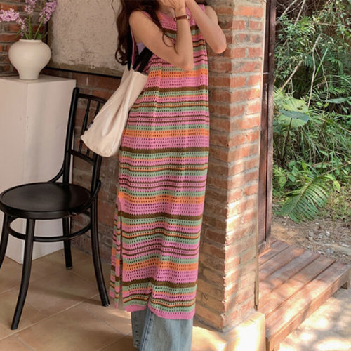 루비루 RB3042 신축성 짱 뜨개 레이스 + 나시 셋트 펀칭 레이어드 롱 뷔스티에 니트 원피스