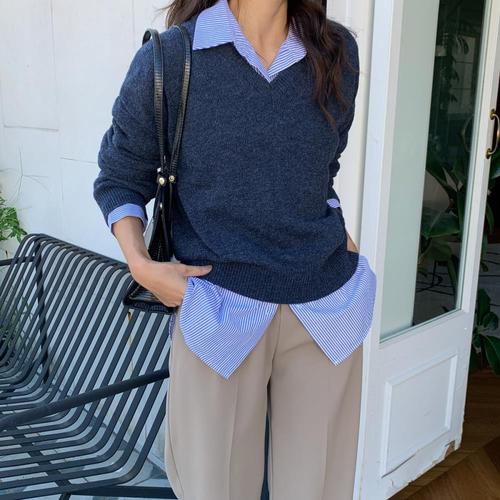 [옷자락] 여자 램스울 심플 브이넥 루즈 니트
