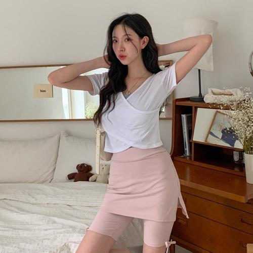 [옷자락] 여자 브이넥 슬림핏 사선 랩 반팔T