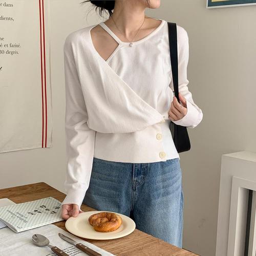 [옷자락] 여자 모던 언발 트임 랩 버튼 니트
