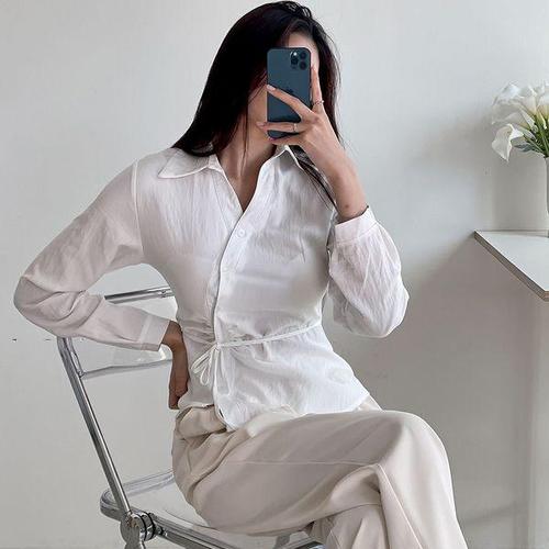 [옷자락] 여자 오피스룩 사선 랩 슬림핏 셔링 스트랩 봄 셔츠