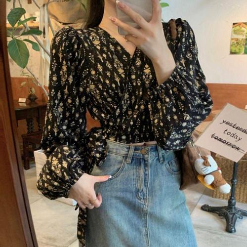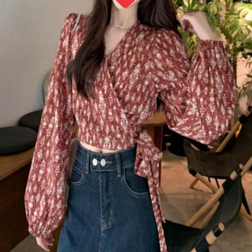셔츠 랩스타일 블라우스 여자 V넥 2색 패턴 퍼프소매 WFKBXAQ