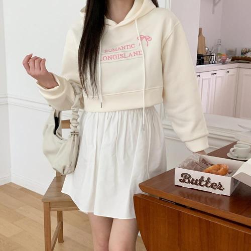 [옷자락] 여자 러블리 레터링 자수 크롭 후드 티셔츠