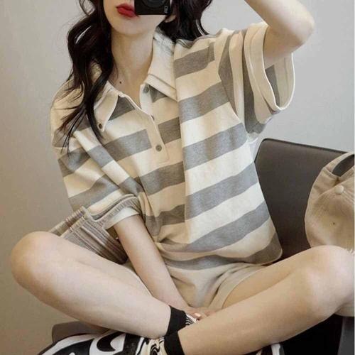 여성반팔티 캐주얼 더블카라 럭비티 스트라이프 WFKBWXJ