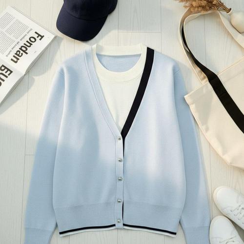 [신상오픈런]여성 여유핏 레이온 혼합 배색 V넥 니트 가디건