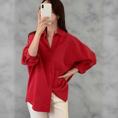 [옷자락]여성 레드 오버사이즈 솔리드 코튼 셔츠