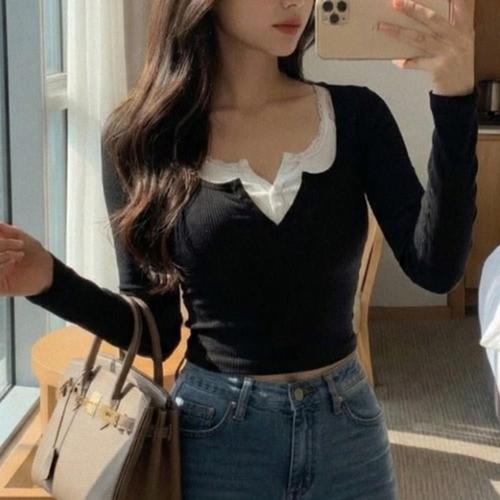 여성 니트 가을 긴팔 티 셔츠 브이넥 슬림핏 롱루즈핏 레이스 BE3