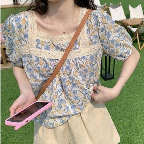 [엘루이즈][엘루이즈] 아루키 레이스 스퀘어넥 링클 캡소매 반팔 티셔츠(2color)
