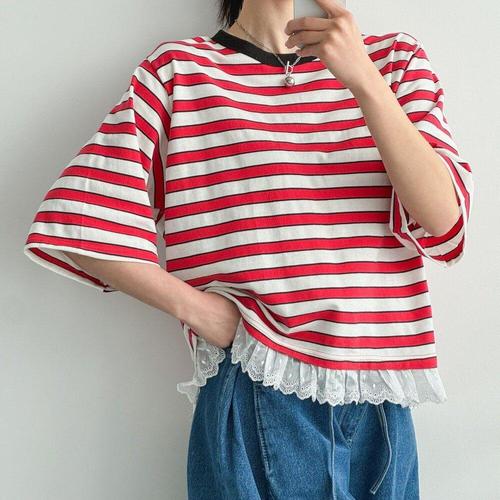 [다잇템]여자 콘트라스트 줄무늬 반소매 레이스 티셔츠