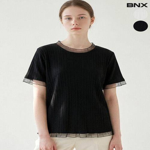 [비엔엑스]여성 레이스 디테일 라운드 골지 반팔 티셔츠
