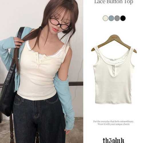 더핑크 / 유딜 슬림핏 레이어드 레이스 버튼 나시
