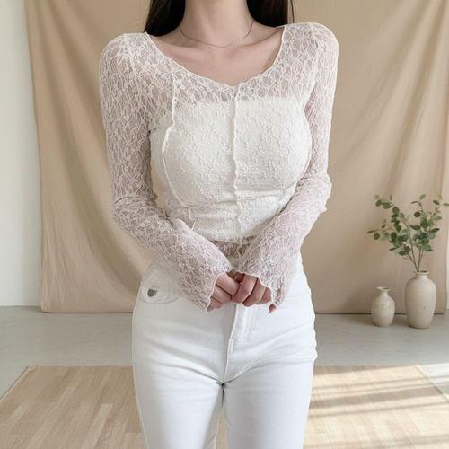 섹시 여성 메쉬 티셔츠 시스루 레이스 블라우스 긴팔 시스루 탑 여성용 이너웨어 셔츠 시어 티셔츠 바디 크롭탑