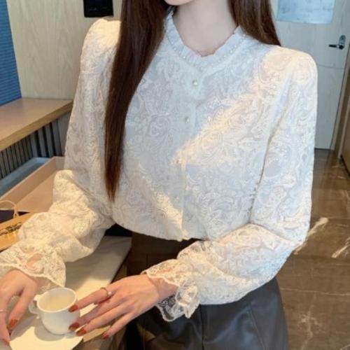 [옷자락]여성 프릴 넥 진주 버튼 레이스 시스루 블라우스