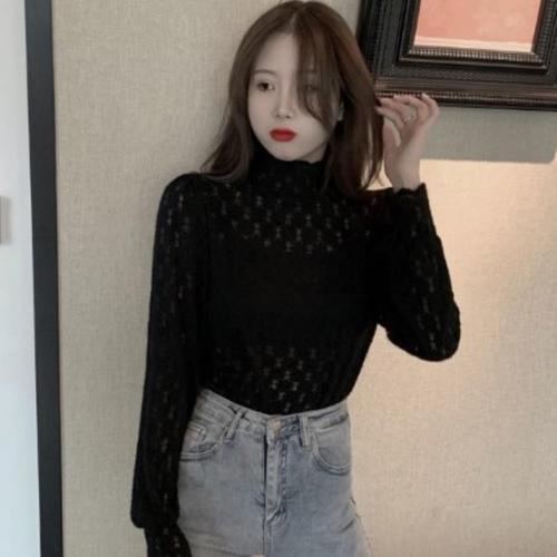 POMTOR 1+1 여성 레이스 셔츠 반폴라 이너 긴팔 티셔츠