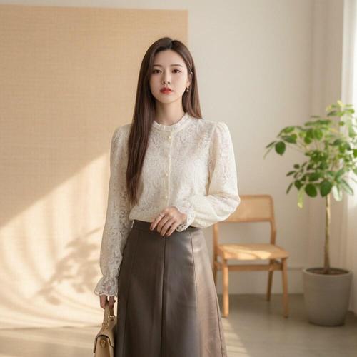 마켓피아 여성용 레이스 블라우스 하이넥 긴팔 티셔츠