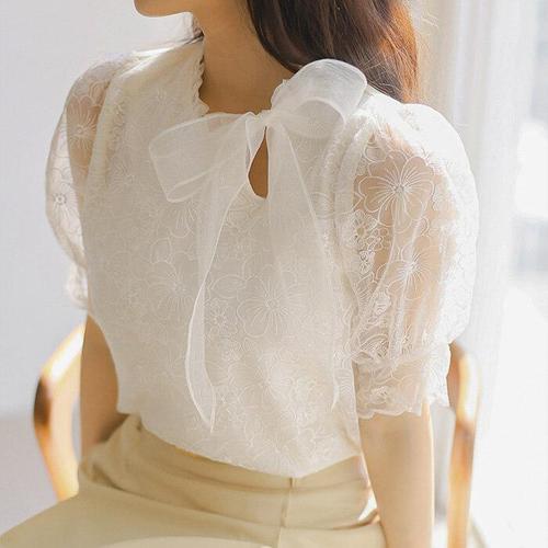 [스타일온미][스타일온미] 플라워 자수 레이스 시스루 리본넥 퍼프소매 블라우스