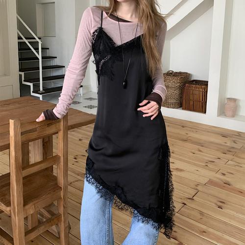 [시크블랙]헤누라 언발 레이스 끈나시 레이어드 원피스