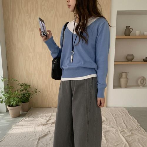 [옷자락]여성 간절기 루즈핏 브이넥 레이어드 니트 나시 세트