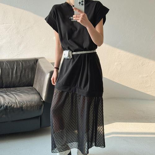 [옷자락] 여자 레이어드 캡소매 도트 시스루 박시 면 롱원피스