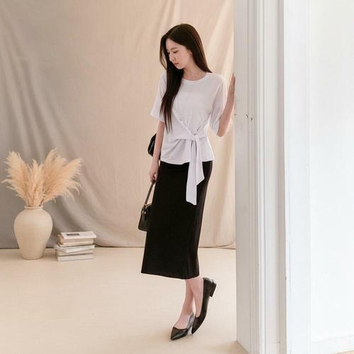 [옷자락] 여자 라운드넥 랩 리본 반팔 티셔츠 폴리레이온 스판 여리핏 상의