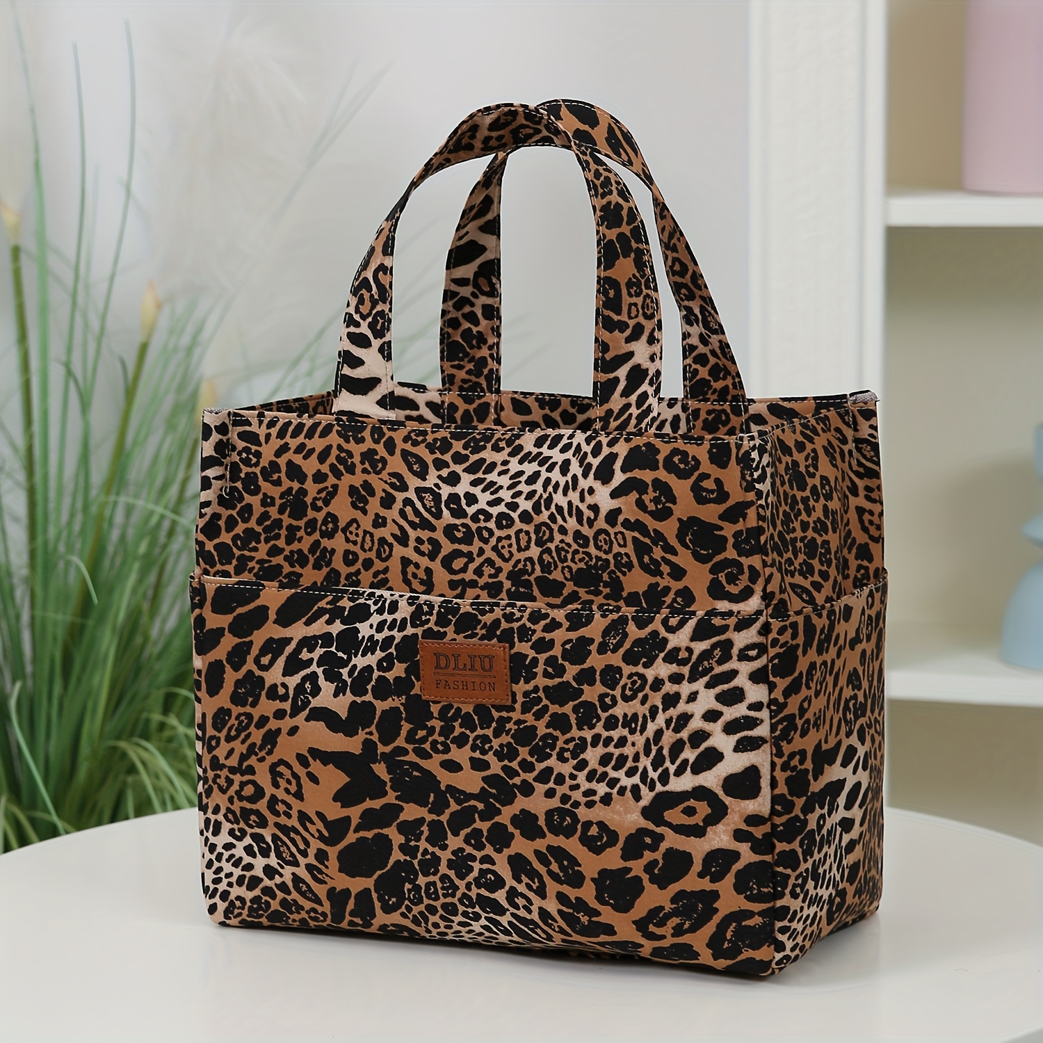 TEMU 새로운 대용량 두꺼운 패브릭 토트백, 지퍼 반마감 디자인의 트렌디한 작업복 스타일, 사이드 컵 홀더 + 앞면 지퍼 포켓, 쇼핑 및 잡화 정리용으로 적합, 레트로 스타일, 프린트, 대용량