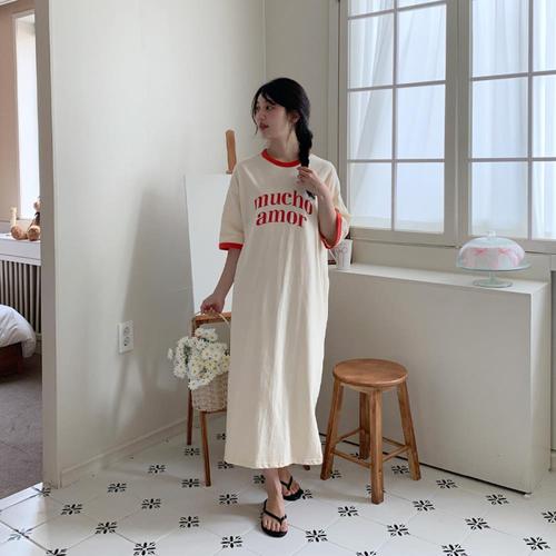 [옷자락] 여자 라운드넥 레터링 일자 반팔 롱 원피스