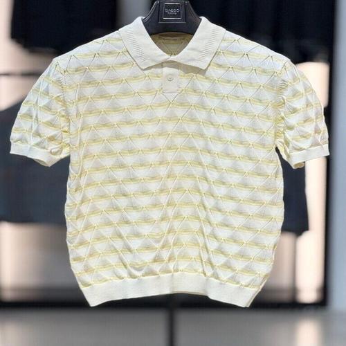 [바쏘옴므]옐로우 면혼방 단가라 아가일 펀칭 카라 반팔 니트_SC