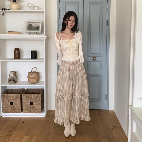 [옷자락] 여성 로맨틱 데일리 외출 여리핏 체크 프릴 롱 스커트