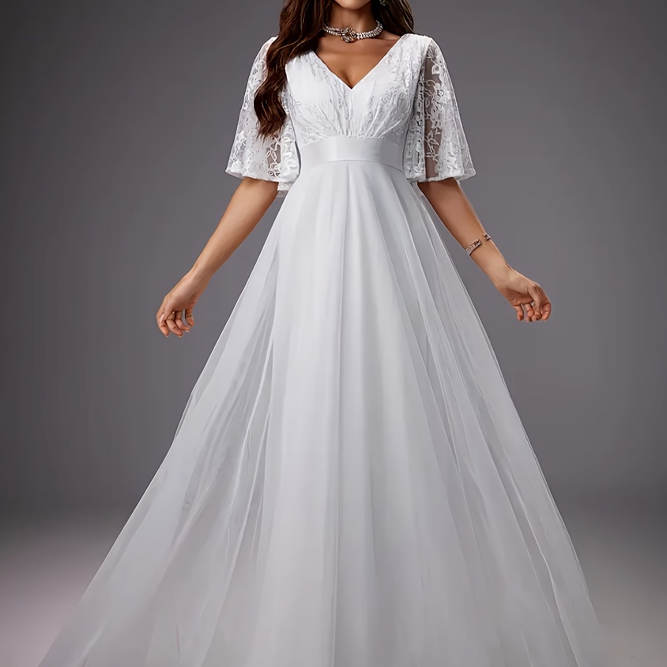 TEMU 우아한 화이트 V넥 레이스 & 메쉬 플로우 튜일 스커트 드레스 - 반팔, 웨딩 및 공식 행사용 브라이덜 의상, 세련된 자수