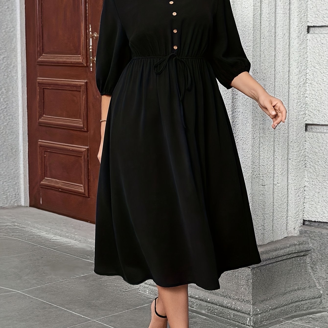 TEMU 플러스 사이즈 - 플러스 사이즈 - 플러스 사이즈용 V넥 퍼프 소매 A라인 드레스, 복부 가림에 적합, 가을, 겨울, 외출, 사무실 복장에 적합, 튜닉 스타일, 여성용 브런치 복장, 여성용 가을 패션