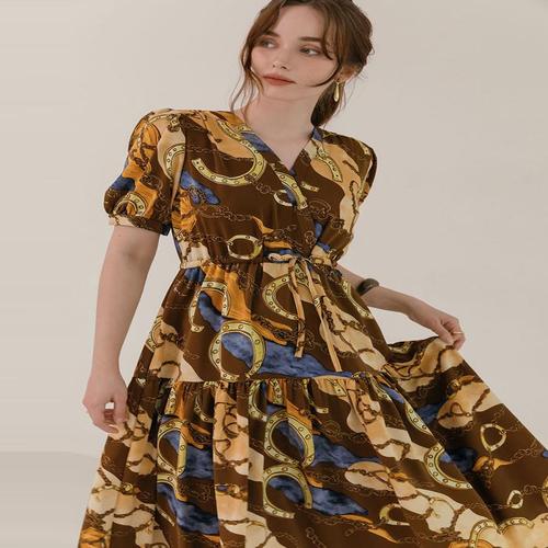 랩스커트 여성 플라워 쉬폰 셔링 브이넥 롱 원피스 (HSJ-WEE8EE6)