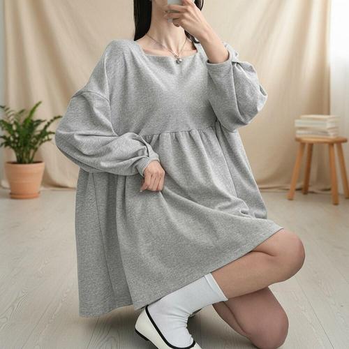 [옷자락]여성 박시 플레어 스퀘어넥 롱티 미니 원피스