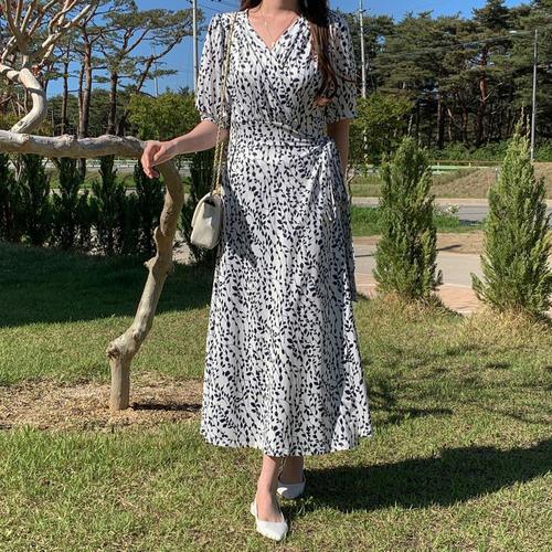 [옷자락] 여자 브이넥 플라워 패턴 모노랩 롱원피스