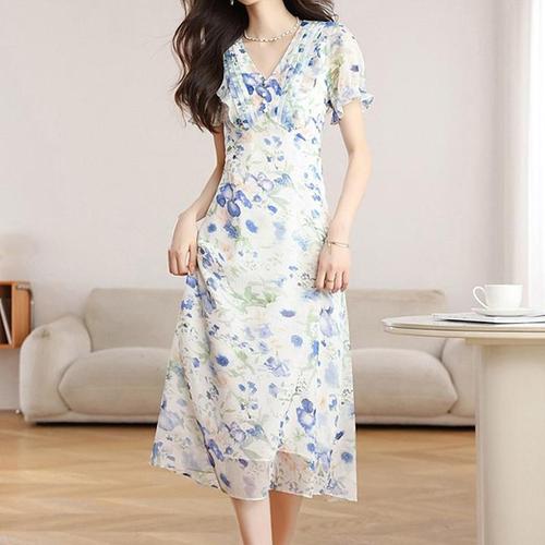 원피스 여름 허리조임 플레어 여자쉬폰원피스 플라워 쉬폰 슬림 브이넥 롱스커트 소매 ible2