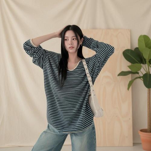 [에이비에프지]카라배색 포인트 루즈핏 스트라이프 긴팔 니트 APZ5QW34G