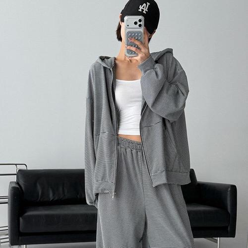 [옷자락]여자 잔줄 단가라 오버핏 후드집업 스토퍼팬츠 세트