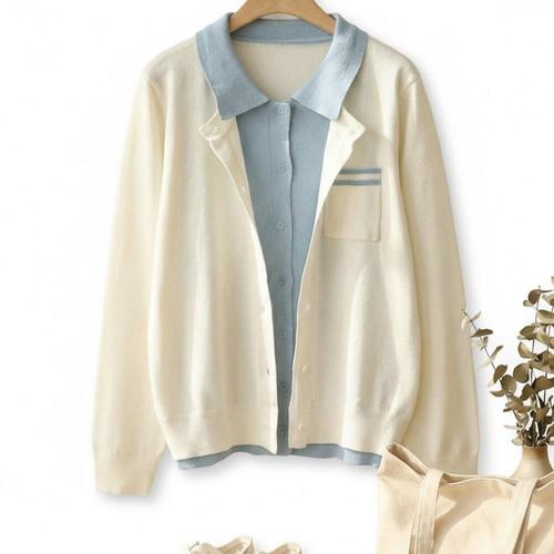 TEMU 컬러블록 브이넥 캐주얼 활용도 높은 한국 스타일 가을/겨울 베이직 슬림핏 몸매 좋아보이는 2-in-1 룩 긴팔 티셔츠