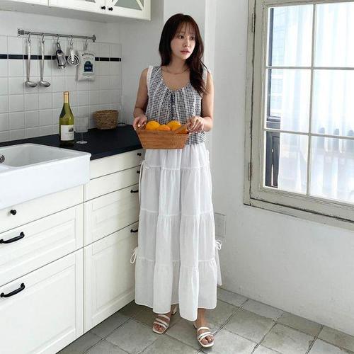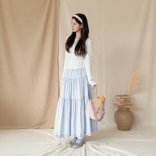 [다잇템]여자 허리밴드 리본 티어드 롱 스커트
