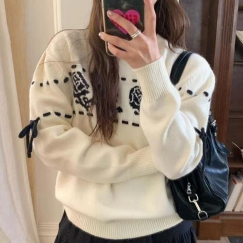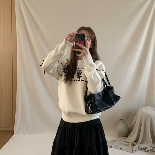 [다잇템]여성 자수 꽃무늬 스웨터 폭신 소매리본 스웨터