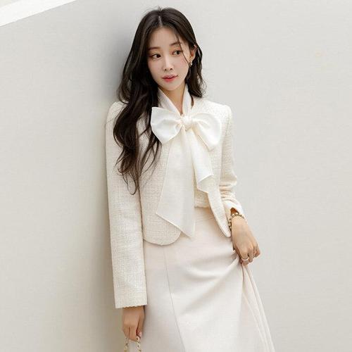 [스타일온미][루이스엔젤] 리오웬 쉬폰 리본 스카프SET 노카라 은은 펄 트위드 자켓