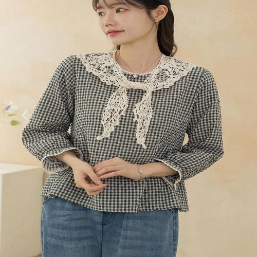 [디얼마미][디얼마미] 체크 물결 린넨 블라우스 /마담 미시 중년 여성 빅사이즈 40대 50대