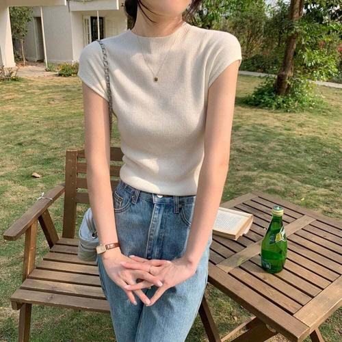 [셀럽하우스]코디피셜 FAJH0194 릴리 얇은 슬림 하프 넥 여성 니트 반팔