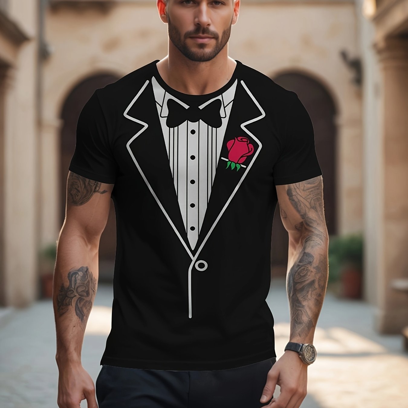 TEMU 목선에 3D 리본이 매력 있게 장식되어 가슴에는 장미 프린트가 돋보이는 남성용 라운드넥 반팔 셔츠는 여름의 핫템으로, 트렌디한 패션 스타일을 완벽하게 표현합니다.