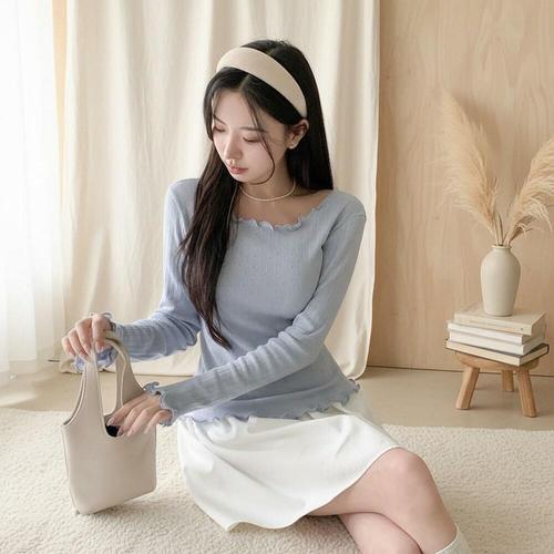 [옷자락]여성 머랭 펀칭 물결넥 긴팔 데일리 티셔츠
