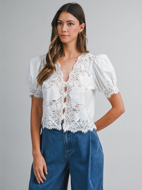 [더 메이블] 브이 넥 레이스 반소매 블라우스