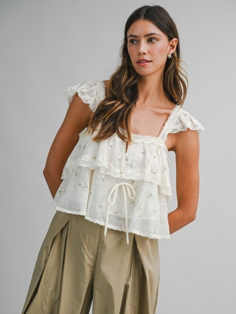 [더 메이블] 플로럴 자수 레이스 트림 슬리브리스 블라우스