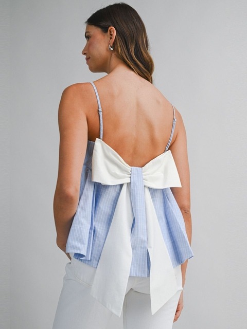 [더 메이블] 스트라이프 페플럼 캐미 탑 위드 백 리본 디테일