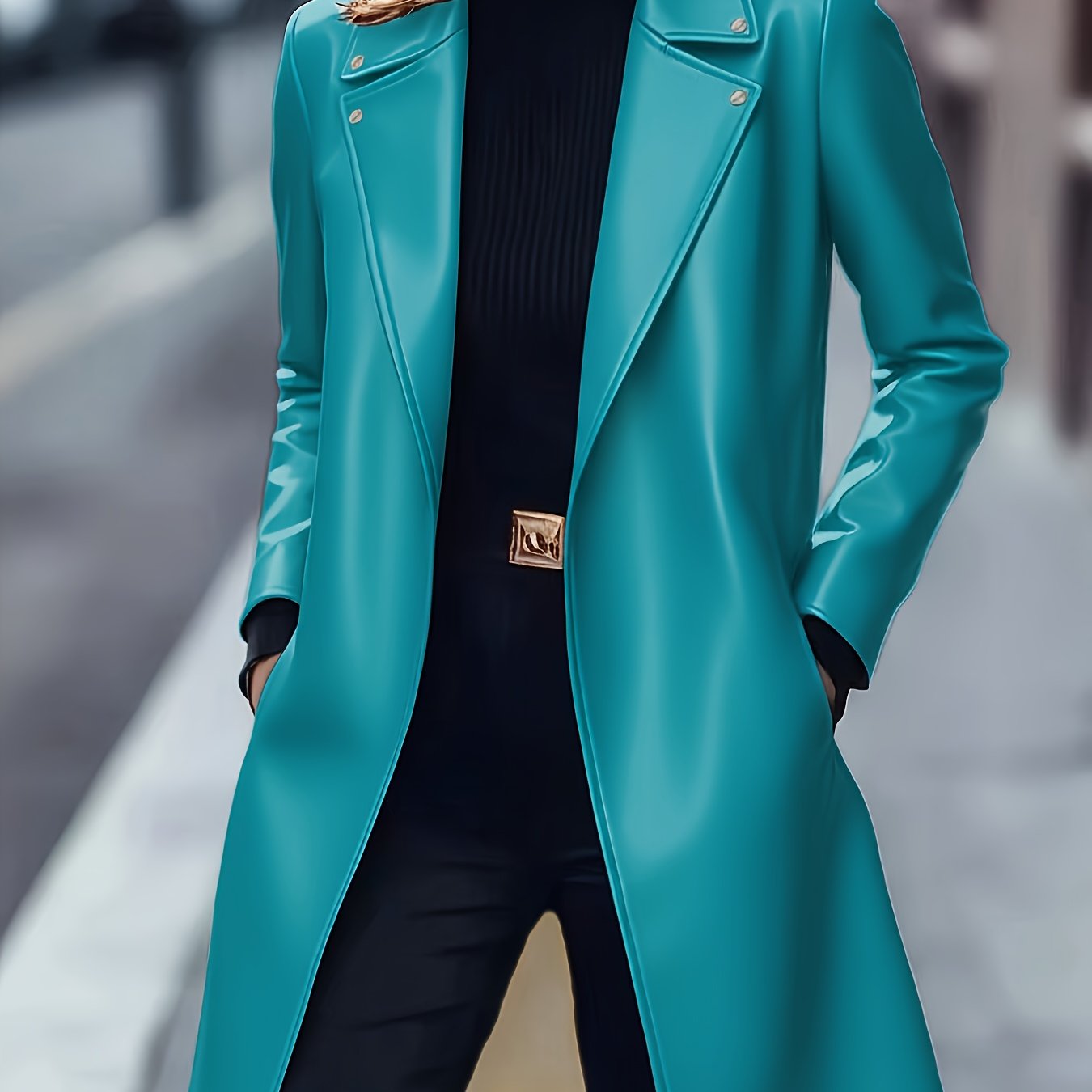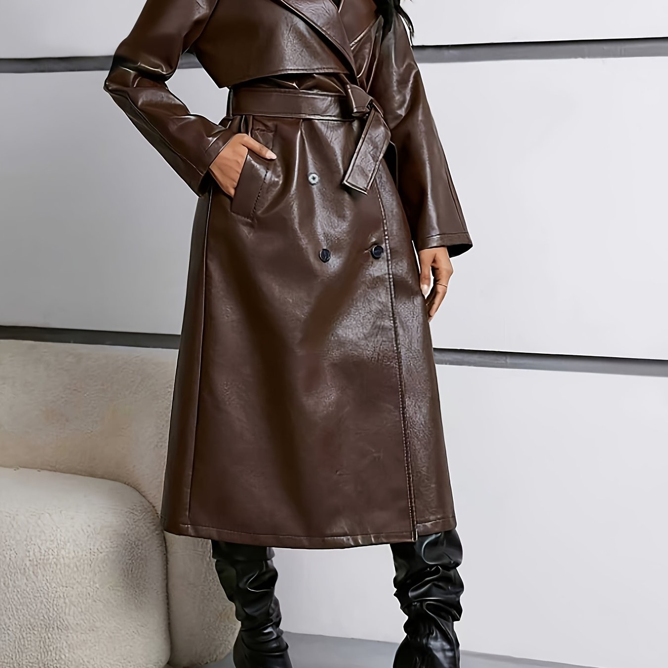 TEMU 여성용 레귤러핏 PU 롱 트렌치 코트 - 대조 컬러 라펠 & 랩 벨트
